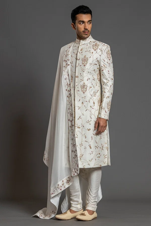 The Pink Trouser Style Bottom, made from Bomario, pairs beautifully with the Straight Cut Style Kurta in Terry Rayon, featuring a Plain design. The Sherwani, in a Pale Lilac color with a Stand Up Collar and full sleeves, is also crafted from Terry Rayon and showcases intricate Cutdana work. There might be a little color variation in the image and original product due to photographic lighting sources or your monitor setting.
